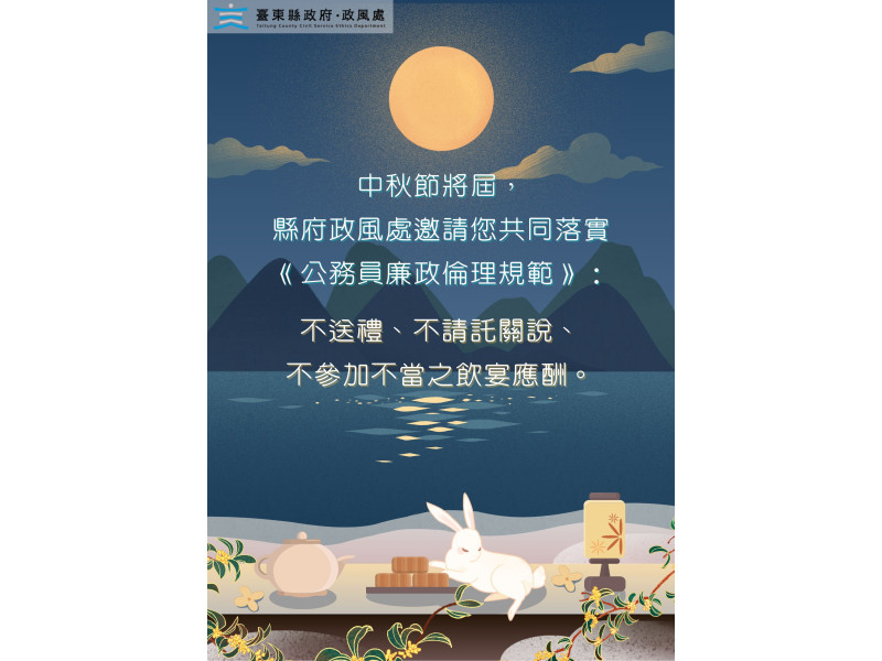 【臺東訊】中秋佳節將屆,臺東縣政府祝福鄉親闔家安康,政風處也特別提醒公務同仁,於節慶期間應恪遵「不受不當餽贈、不應邀不當飲宴應酬、不請託關說」之原則,共同守護臺東清廉形象。