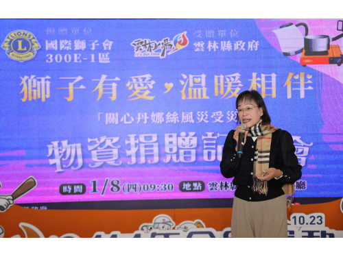 雲縣府今(8)日上午於本府親民大廳辦理「獅子有愛,溫暖相伴-關心丹娜絲風災受災戶」物資捐贈記者會,由謝淑亞副縣長受贈,並代表雲林鄉親感謝國際獅子會300E-1區捐贈物資,傳遞愛心的同時,更凝聚社會向心力,期盼未來持續攜手前行,打造幸福有愛的縣市。