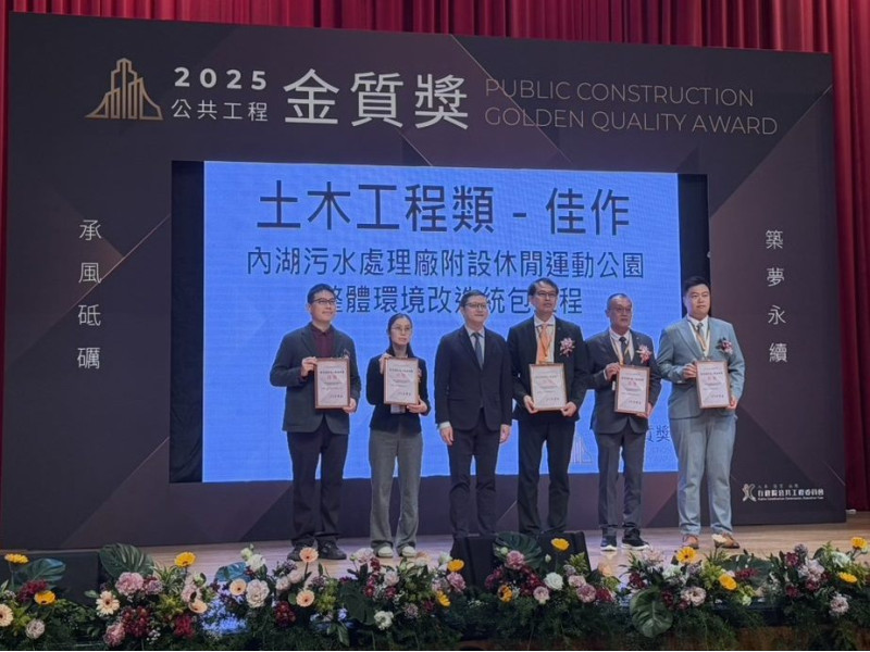 【臺北訊】行政院公共工程委員會日前公布「第25屆公共工程金質獎」得獎名單,臺北市政府工務局衛生下水道工程處辦理之「內湖污水處理廠附設休閒運動公園整體環境改造統包工程」,榮獲公共工程金質獎佳作殊榮。工程會並於今(21)日舉行頒獎典禮,由衛工處代表出席領獎,顯示本案工程品質及整體規劃成果,獲評審委員高度肯定。
