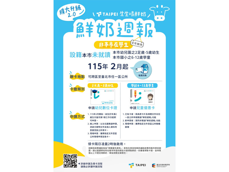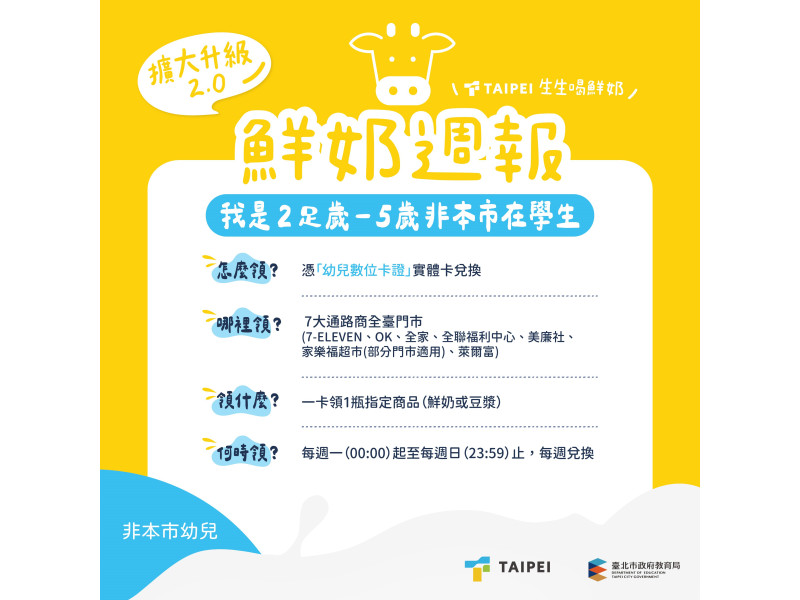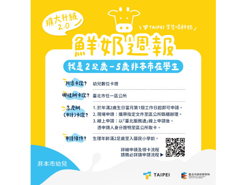 教育局也表示,臺北市致力於打造「育兒友善環境」,從滿2歲開始的一瓶鮮奶,就是城市為孩子健康打底的溫柔承諾。相關申請資訊與兌換品項,歡迎家長至「鮮奶週報」專區網站查詢(https://milk.tp.edu.tw/)。