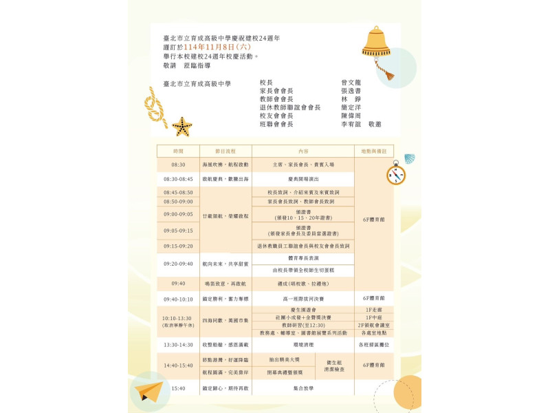 【臺北訊】臺北市立育成高中24週年校慶於11月8日(星期六) 上午8時至下午4時,盛大舉行創校二十四週年校慶暨三年一度的園遊會。本屆校慶以「育苗廿載,成才四海」為主題,闡明了我們對學生的期許與年度目標的結合。將學生比喻為準備出航的船隻,而我們所重視的交通安全意識,正是為他們裝備最穩固的羅盤與船舵。透過頻繁的國際交流,學生們得以將所學付諸實踐,安全自信地航行於全球,在「四海」之間留下屬於育成的光芒。