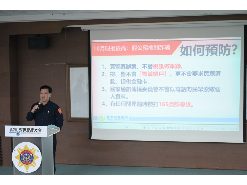 警察局魏仲亨副局長指出,根據內政部警政署165打詐儀錶板顯示,臺東縣於上(10)月間共發生67件詐欺案件,總財損為新臺幣2,273萬元,前5大高發手法中依序為「網路購物」、「假投資」、「假銀行借貸」、「色情應召詐財」及「假公務機關」詐騙手法,提醒民眾留意假網路購物詐騙,並解析收到「詐騙包裹」的處理管道;而財損金額最高為假公務機關詐騙,總財損為新臺幣1,023萬元,佔整體45%,近期「普發1萬元」政策亦成為不法集團行騙話術,藉此機會與郵局聯手宣導,盼提高大眾識詐知能。