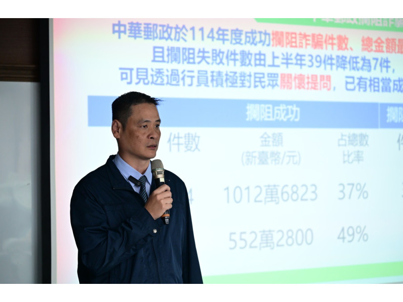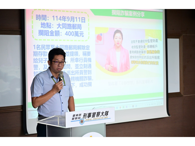 中華郵政臺東郵局陳聖志副理於致詞時,提及近期成功攔阻多起臨櫃匯款的詐騙案件,未來持續與警方合作,讓防詐意識更深入民眾生活。其中臺東大同路郵局江富瑋經理分享於9月間,機警行員即時關懷提問,與臺東警察分局寶桑派出所員警齊心攔阻詐騙,金額達新臺幣400萬元,顯示同仁的警覺與通報機制發揮關鍵作用。