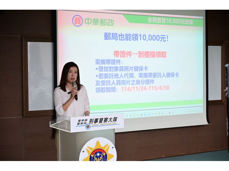 隨後臺東郵局行銷科葉詩縈科長分享,全民普發1萬元政策上路,民眾可於11月24日起攜帶證件(具照片健保卡)至郵局領取,並提醒普發現金防詐3「不」:不需匯手續費、不點擊來路不明連結、不把金融卡交付予任何人,避免遭詐。