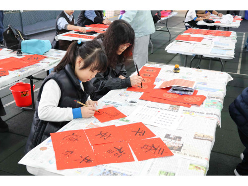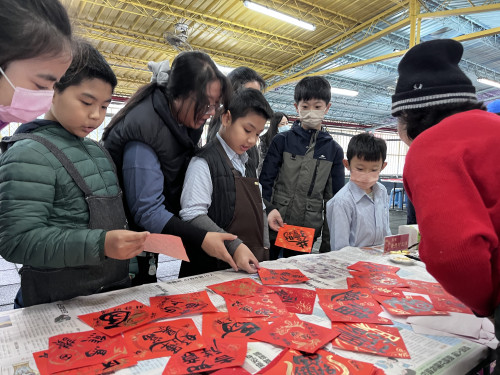 本次活動以「雙軌體驗」串起傳統與創新,13組親子在長桌前同框揮毫,中文春聯與英文祝福語相互輝映,筆尖寫下的不只是字,更是跨世代的陪伴與祝福,同時各班級輪流走進觀摩區,看見書法家一氣呵成的神採,聽見墨筆摩挲紙面的細微聲響,孩子們在驚嘆中領取屬於自己的春聯,把文化的溫度帶回教室與家庭。