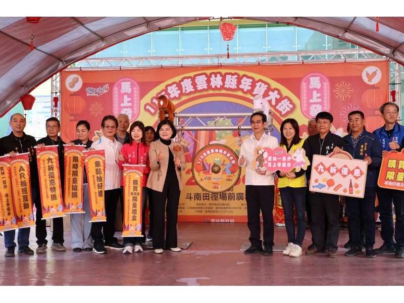 【雲林訊】農曆新年將至,雲林縣政府與斗南鎮公所於今、明兩日在斗南田徑場前廣場舉辦「115年度雲林縣年貨大街展售活動」。今(7)日由縣長張麗善敲鑼揭開序幕,斗南鎮長沈暉勛、議員蔡東富、簡慈坊、雲林縣土風舞協會理事長洪惠玲、斗南鎮民代表會主席陳大華、副主席黃藏諒及多位代表、里長等人到場共襄盛舉,邀請全台民眾把握週末走進雲林斗南採買年貨、享優惠、迎新年。