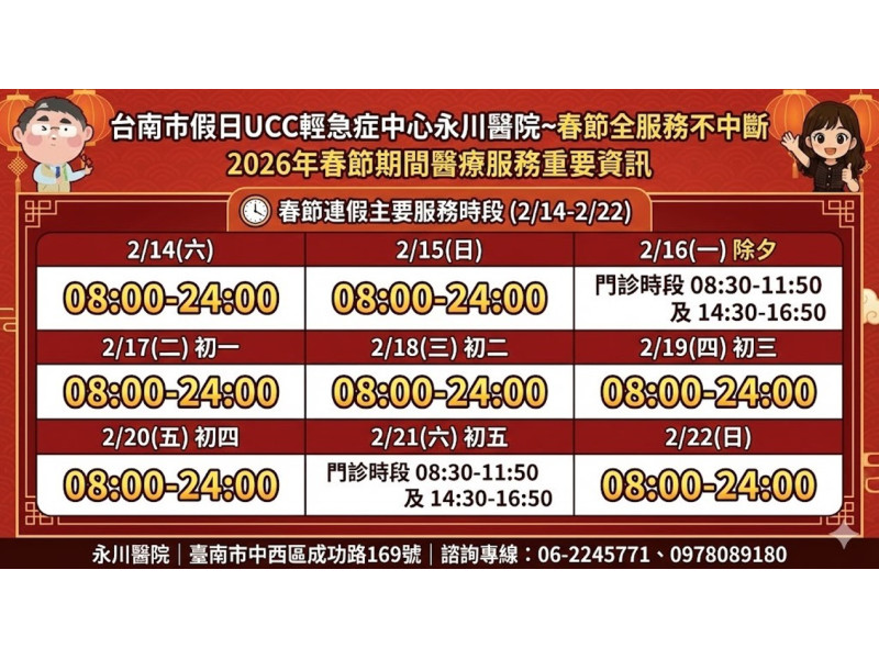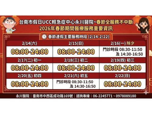 三、 輕急症分流:UCC永川醫院全時段服務 春節期間,若出現感冒、腸胃炎等「輕急症」症狀,建議市民優先前往本市假日輕急症中心(UCC)—永川醫院(地址:中西區成功路169號)就醫。