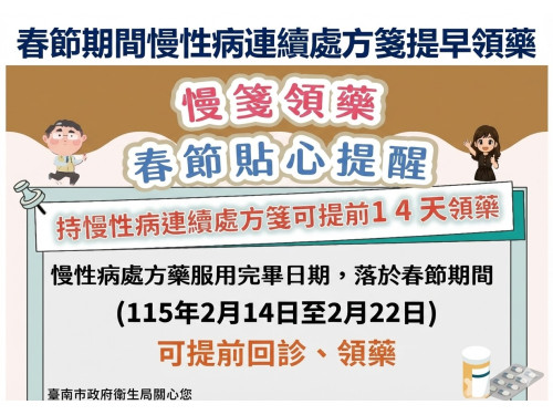 二、 慢箋領藥提前跑:1月31日起開放領藥 為避免慢性病患者於年節期間斷藥,衛生局特別呼籲,若持有慢性病連續處方箋的市民,藥品用完日期落在115年2月14日至2月22日春節期間者,可提前自115年1月31日(含)起,回診請醫師開立處方箋,或持慢箋至健保特約藥局領取下個月藥品。
