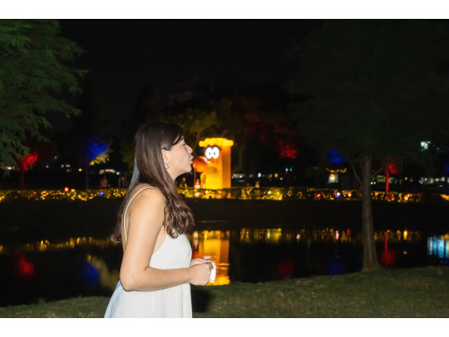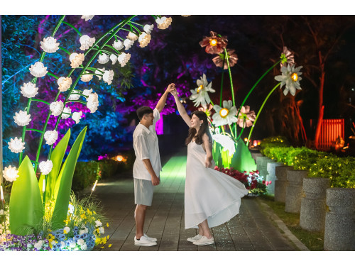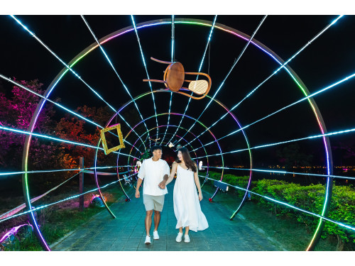 三年前在「ICHIAYIU(我佮意你)」光影裝置前浪漫告白的新人,今年也攜手再度回到北香湖,於「2025嘉義市光織影舞」現場重溫當年的心動與承諾。光織影舞不僅點亮嘉義市的夜晚,更點亮屬於他們的愛情故事。 2022年展出的「ICHIAYIU(我佮意你)」裝置,設計靈感結合嘉義市標準字體與嘉義方言諧音,成為情侶表達愛意的最佳拍照點。一對情侶當年就在這裡告白,求婚影片還曾登上紐約時代廣場的大螢幕。如今兩人已步入婚姻,今年再度回到定情之地合影留念,他們笑說當年的浪漫,正是從「我佮意你」開始。