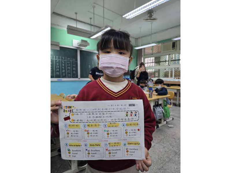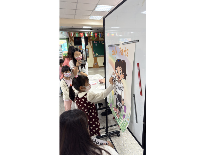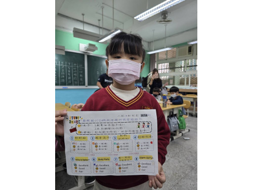 老師設計貼近生活的學習任務,校園歡呼聲此起彼落,交織成一幅幅充滿學習熱情的畫面。注音符號闖關內容分別有「對對碰」及「調音高手」。「對對碰」關主先選定2張牌卡,學生依照圖卡內容,選出正確的詞卡,並唸出來。「調音高手」關主則是選定2張牌卡,學生閱讀牌卡,再填入正確的聲調符號。學生2題都通過時,臉上的笑容藏不住,成就感十足!「數學好好玩」透過圖片與數字對應,以說、聽、做等活動,找出相同點數的數字牌。有的關卡結合雙語健康「Body Parts」遊戲,學生需拿起字卡,聽老師念出圖片裡的人物的Head、Chest、Hand、Knee and Leg,並將圖卡貼在圖片上。「Warm-Up Fun」關卡結合雙語體育,配合老師口令「Waist Circles」、「Jumping Jacks」及「Ankle Circles」做出動作。