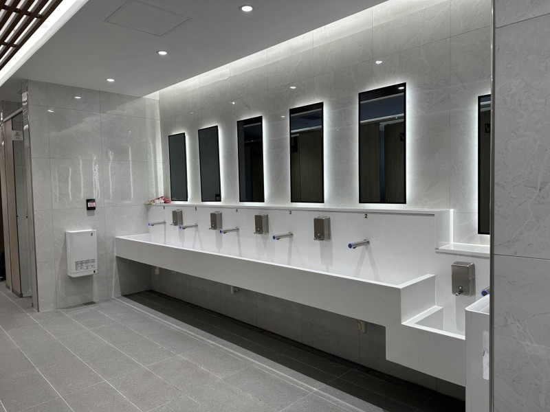 廁所全時環境智慧偵測,提供溫度、氨氣、CO₂與 PM2.5等指標,智慧偵測、自主聯動空調與排氣系統,透過定時排氣與智慧監控同步運作,加強除臭與換氣效能,維持空氣清新舒適。
