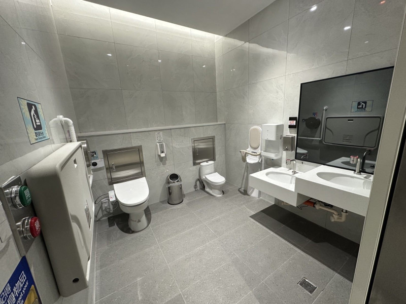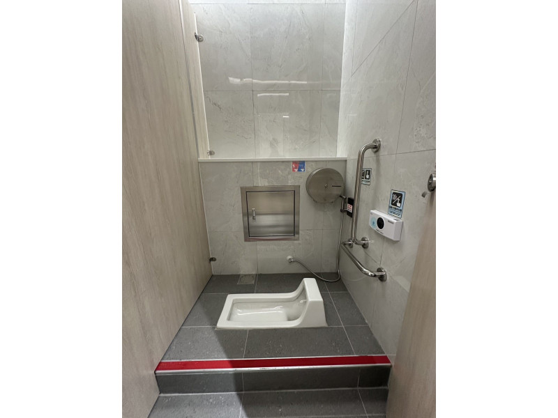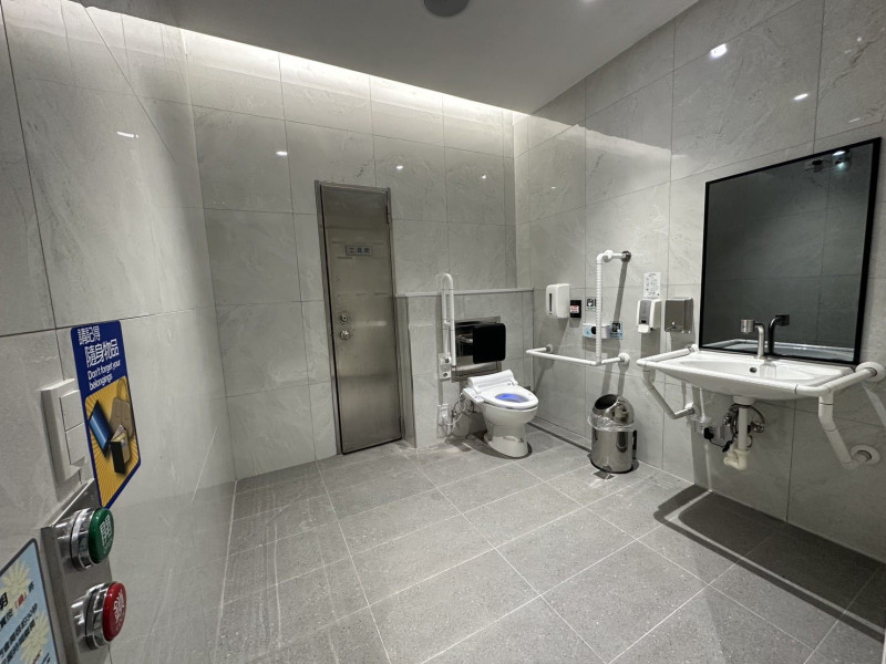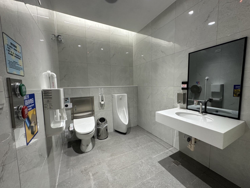 人員安全方面,選用止滑、抗汙及易清潔的深灰色板岩紋路地磚;廁間內全面裝設扶手;蹲式廁間階梯邊緣皆設置崁入式止滑條;水龍頭、烘手機、馬桶及便斗沖水器等,採用自動感應偵測,提升人員使用安全與衛生。