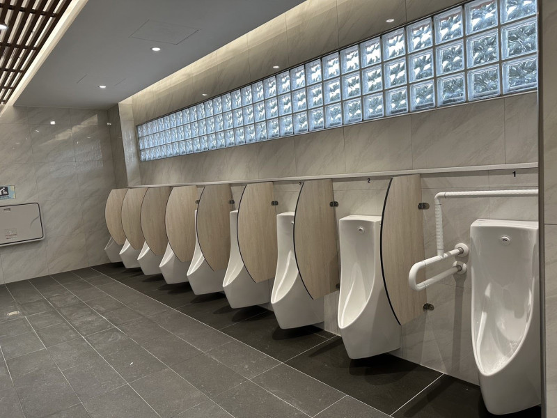 男廁配置加長型小便斗,兼顧成人與兒童友善的通用設計,小便斗地面則採光觸媒陶瓷地磚,並具有除臭效果。