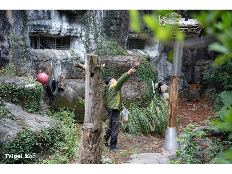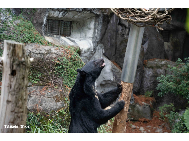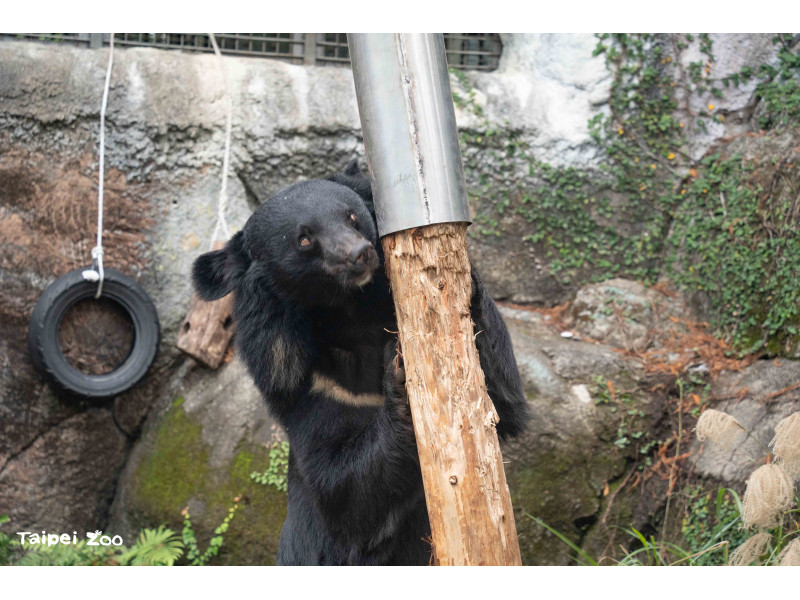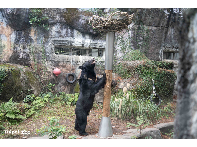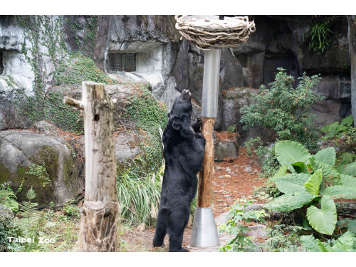 在野外山林中,雜食性的黑熊食物來源相當多樣,有地面、枯枝落葉或土堆等需要翻動挖掘的地方,以及樹上需要攀爬抓取的位置。為了促進動物園照養的黑熊展現自然覓食行為,保育員特別構思了新的行為豐富化設施,遠看就像棵樹木拔地而起,頂部又狀似鳥巢可以乘載物體。行為豐富化設計的立柱採用圓杉木,除了以自然素材提升觸感,也方便更換或調整高度,鐵製套筒則是避免黑熊攀爬造成危險。新行豐設施主要是利用黑熊敏銳的嗅覺,引導動物在採食過程中運用不同肢體部位與身體肌群,提高取食難度也延長進食時間。