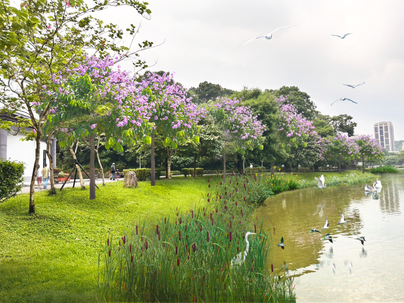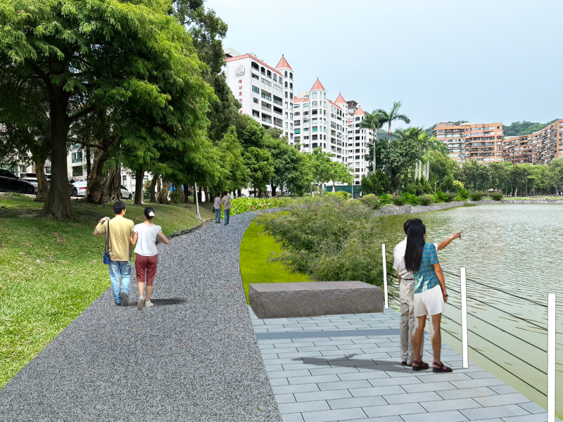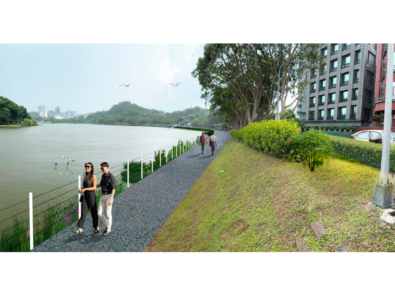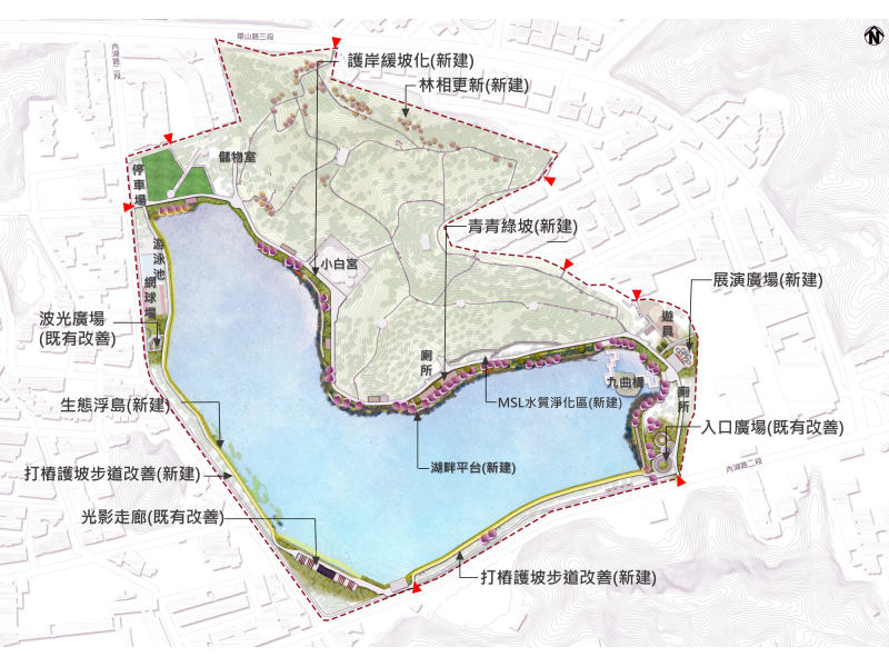 本工程基地位於內湖區核心地帶,園區地形起伏,結合山坡地綠地與湖岸水域景觀,工程將針對湖岸護岸進行改善及緩坡化設計,透過適當的工法提升湖岸安全性,並兼顧山坡地穩定與水域生態需求;同時整合環湖步道系統與周邊休憩節點配置,優化動線的銜接與使用機能,提供民眾更安全、舒適之遊憩空間。