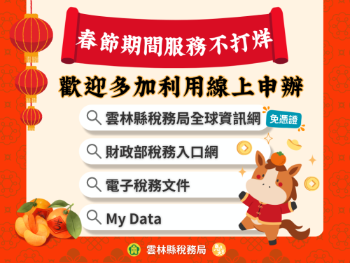 【雲林訊】雲林縣稅務局表示,春節期間稅務服務不打烊,民眾如有申辦稅務資料需求,可透過該局官網或財政部稅務入口網進行線上申請,相關案件將於收假後儘速處理。