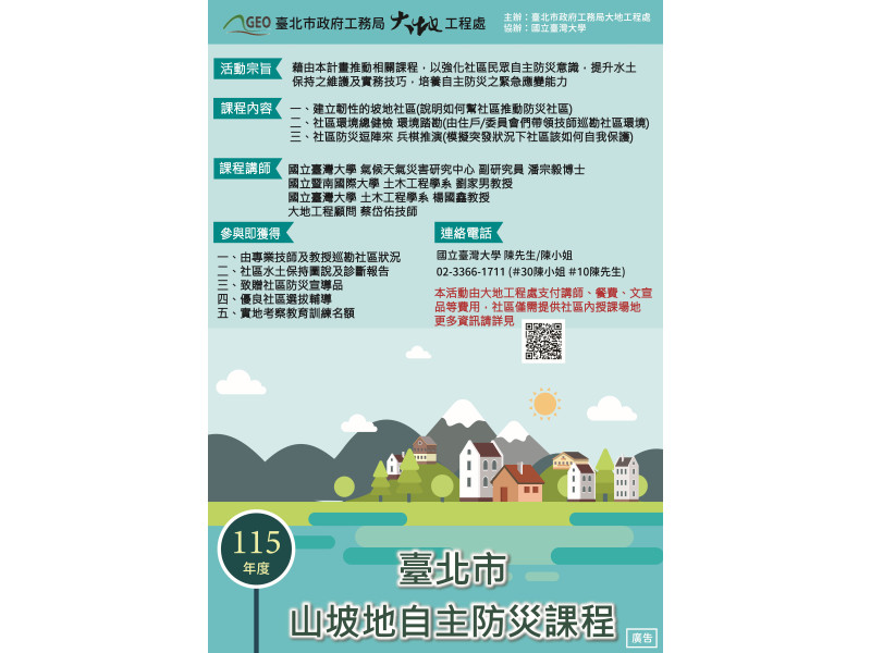 【臺北訊】「山坡地社區自主防災」課程開放報名囉!臺北市政府工務局大地工程處再度攜手國立臺灣大學氣候天氣災害研究中心團隊,走入社區把最實用的防災知識帶給居民,強化山坡地社區平時預防、災時應變及災後復原的能力。